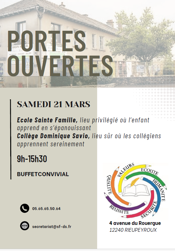 Cette année les portes-ouvertes de l’École Saint Famille et du Collège Dominique Savio se dérouleront le samedi 21 mars de 9h à 15h30 où un buffet convivial attendra les futurs élèves et leur famille. Au fil de leur déambulation, les visiteurs, guidés par des collégiens fiers de promouvoir leur établissement, rencontreront l’ensemble des membres de la communauté éducative afin d’échanger tranquillement. Les portes ouvertes sont l’opportunité de découvrir un lieu, des projets et surtout des personnes au service de la jeunesse ayant à cœur quotidiennement d’assurer au mieux leur mission. L’exigence et la bienveillance étant les moteurs d’une éducation performante, ces valeurs sont au centre du projet éducatif de cet ensemble scolaire. C’est donc bel et bien un endroit privilégié où les petits comme les grands apprennent en s’épanouissant dans un cadre serein.
